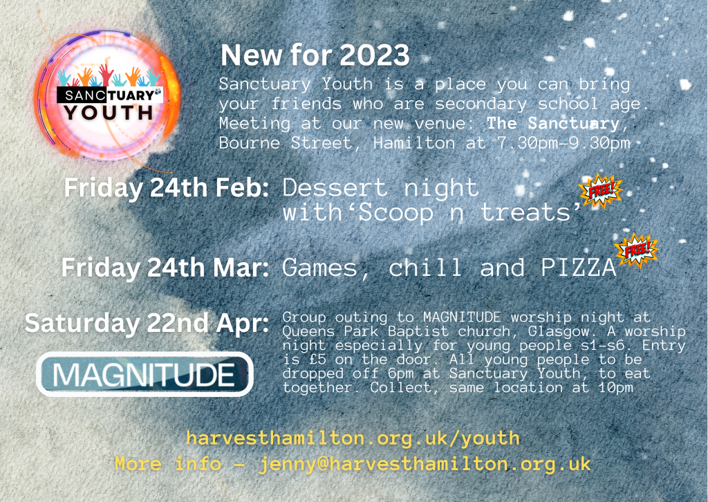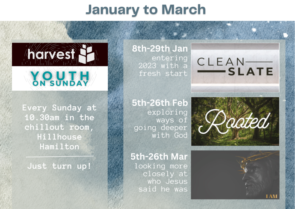 Hi! Welcome to Youth at Harvest. Our Youth gatherings are for all secondary school aged young people. We meet every week on a Sunday morning alongside the church service and once a month for Sanctuary Youth where we get to hang out together. Check out the plans for the next season below.